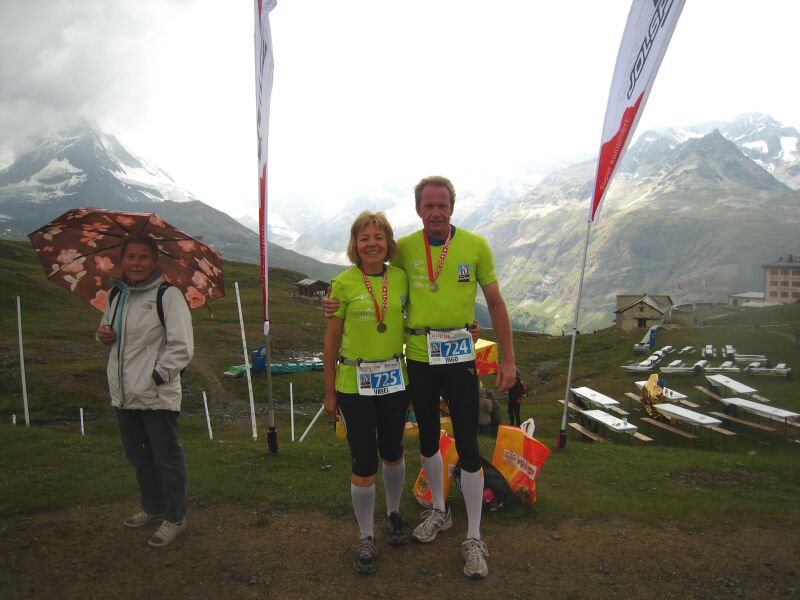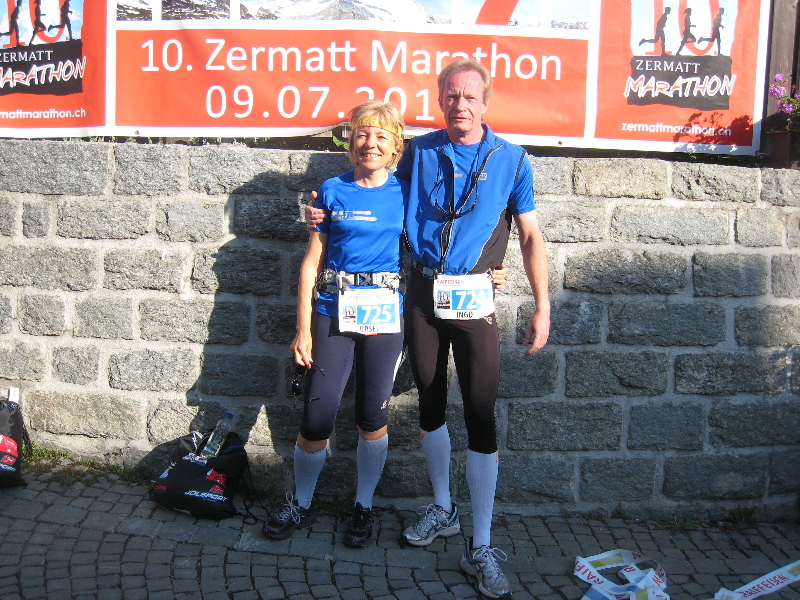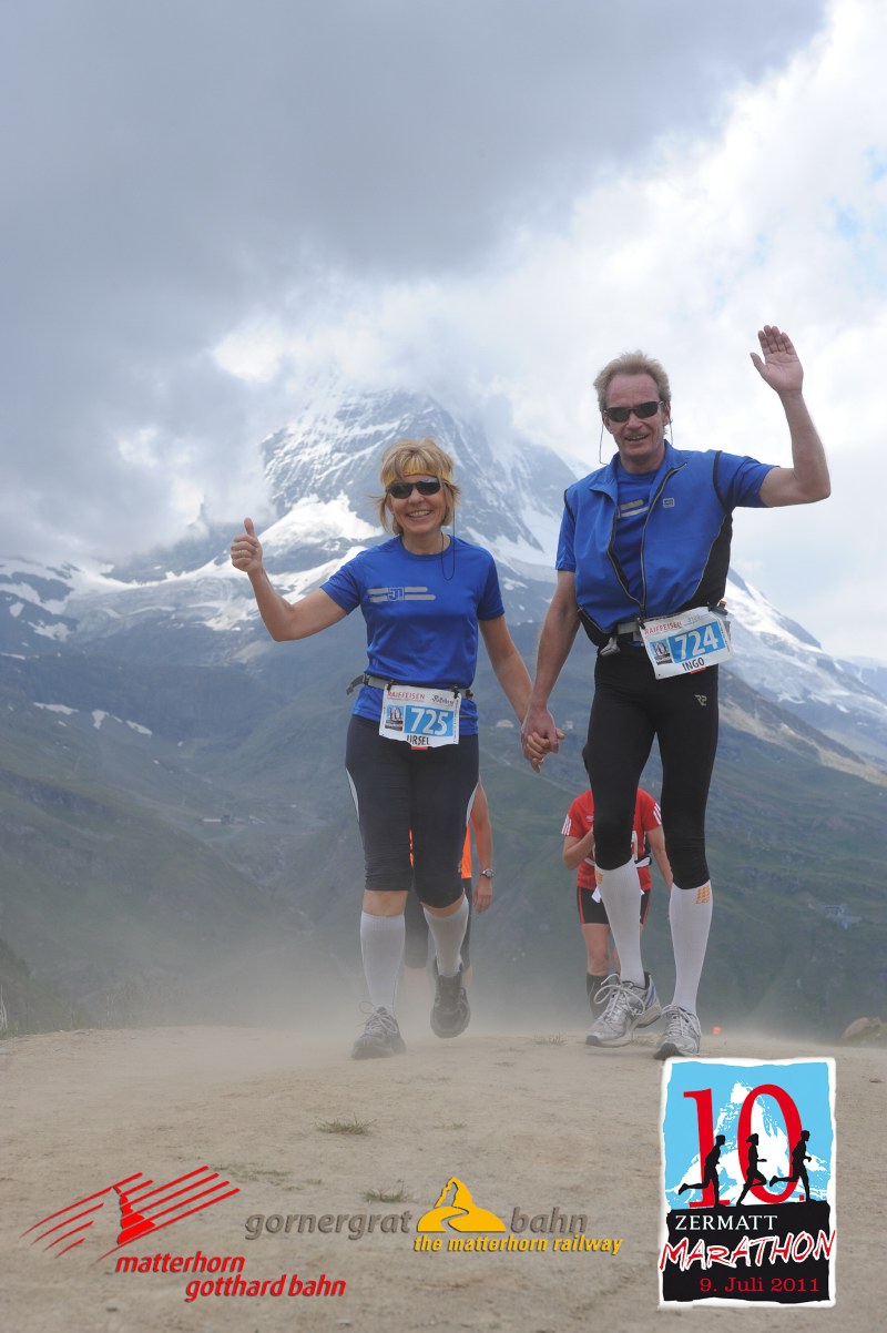 Diagnose: Virus Bergmarathon Infiziert vor 2 Jahren bei unserem 1. Bergmarathon in Zermatt fuhren wir in diesem Jahr erneut in die Schweiz um mit ca. 2100 Läufern dem Matterhorn entgegen zu laufen. Von St. Nikolaus 1085m auf den Riffelberg 2582m müssen wir 1500 Höhenmeter bewältigen. Ausdauer und kleine Berge trainierten wir in der Saarbrücker Umgebung, was uns fehlt ist die Höhe. Zur Akklimatisation müssen uns 2 Tage in den Schweizer Berge reichen. Mit der Cornergradbahn fahren wir 1 Tag vor dem Lauf zum Riffelberg und schauen uns diese schwere Teilstrecke nochmals an. Das Wetter ist vielversprechend, morgens zum Start Sonne ca. 20 Grad, nachmittags müssen wir mit Gewitter rechnen. Das bedeutet für uns möglichst am frühen Nachmittag das Ziel erreicht zu haben. In 6 Stunden wollen wir oben sein! Am 9. Juli ist es soweit, aufgeregt reihen wir uns um 9 Uhr mit all den Läufern bei super Bergwetter im Startbereich ein. Tausend Gedanken gehen mir durch den Kopf, reicht unser Training aus, hoffentlich kein Sturz, wer wird schneller, sein das angekündigte Gewitter oder wir. Die Anstrengung und die schöne Natur lässt den Alltag schnell vergessen. Von St. Nikolaus über die Dörfer Herbriggen, Randa und Täsch nach Zermatt sind es 21km. Die Einheimischen mit ihrem hopp hopp die Kapellen und der Klang der Kuhglocken sorgten für zusätzlichen Adrenalinschub. Für anhaltende Power sind 10 Verpflegungsstationen eingerichtet. Die Kräfte müssen gut eingeteilt werden, denn heftige Steigungen sind zu bewältigen. Lustige Begegnungen und einem freudigem Hallo mit einem Zahnbürstenläufer (Lionheart und Susanne vom Team Bittel kennengelernt beim Parismarathon) und einer Gruppe Neandertaler ließen die Anstrengung zwischendurch vergessen. Nach dem langen Anstieg zur Sunegga und Gant sehnte man das Ziel herbei, aber noch liegen 10km vor uns. Das ist doch nur noch ein Trainingslauf so munterte ich mich selbst auf. Kurze Verschnaufpause haben wir anschließend 4 km abwärts zur Riffelalp, wir rollen so richtig den Berg hinunter. Von weitem sehen wir den steilen Aufstieg parallel zur Cornergradbahn. Letzte ganz große Anstrengung wird uns abverlangt, die Beine sind schon sehr müde und 3km heftigste Steigung zum Riffelberg liegen vor uns. Mit dem Wissen danach ist es geschafft setzten wir nochmals ungeahnte Kräfte frei. Nach 6:07 überqueren wir müde aber mit unendlichen Glücksgefühle die Ziellinie am Riffelberg. Wir haben es geschafft!! Bei 5 Grad und aufkommenden Gewitterregen ziehen wir warme Kleidung an und genießen für eine kurze Zeit die Atmosphäre am Fuß des Matterhorns. einen weiteren Bericht vom Team Bittel gibt es auf deren Internetseite http://www.teambittel.de/ ![]()