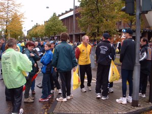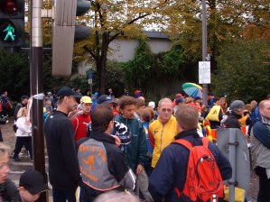 Dort angekommen ging es mitten hinein ins Vergnügen. Irgendwo einen Platz finden, wo man sich umziehen konnte, danach Kleiderbeutel abgeben und im Startblock einchecken. Pünktlich zum Start, hat es dann auch wieder angefangen zu regnen, was aber nicht so schlimm gewesen wäre, hätte der kalte Wind nicht so geblasen. Doch jetzt gab es kein zurück mehr.